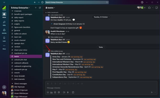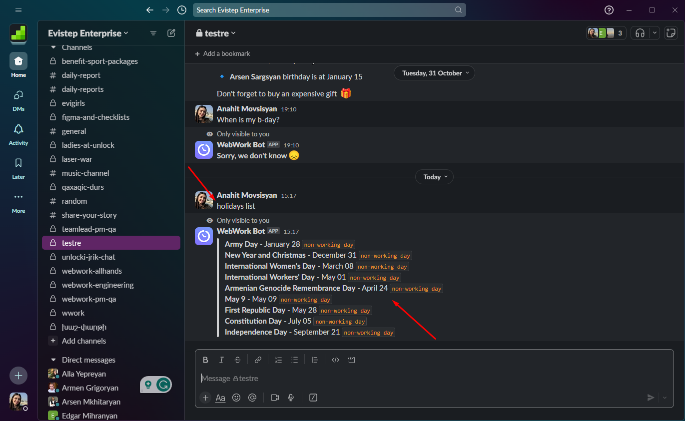 - When the Owner/Executive Manager creates a holiday for the workspace and for the channel → there is a notification about the upcoming Holidays and Memorial Days 2 days in advance. The notification includes whether it is a working or a non-working day and a holiday greeting. Also on the selected day, the greetings message is displayed in the channel.
