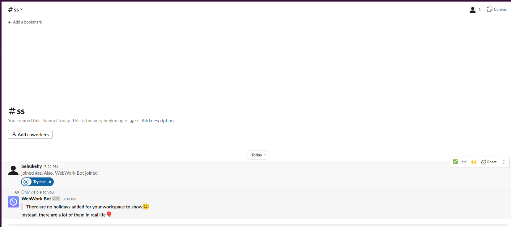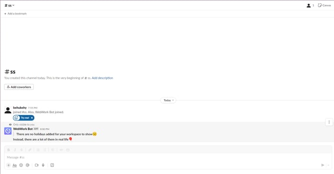 - If there isn't any holiday created for this workspace and the user selects the /webwork holidays or /webwork_ask holidays (or one of the above-mentioned commands → displays a message ”There are no holidays added for your workspace to show☹️”