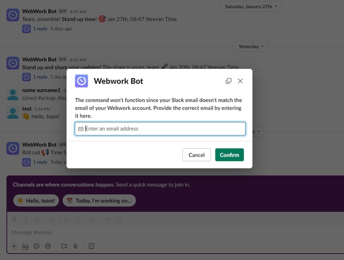When a user chooses any command and their Slack email differs from the email associated with their Webwork account, a popup is displayed prompting them to enter their preferred email.