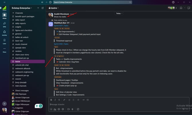 - When the user types Show my tasks or I want my task list in the channel → there are shown all the tasks assigned to the user. (The tasks are being assigned to the user from the Task section by the Owner/Executive Manager/Project Manager)