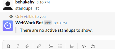 If there is no standup created for the workspace and the user selects the /webwork standups or /webwork_ask standups list (or one of the above-mentioned commands) there is shown the message “There are no active standups to show.”.