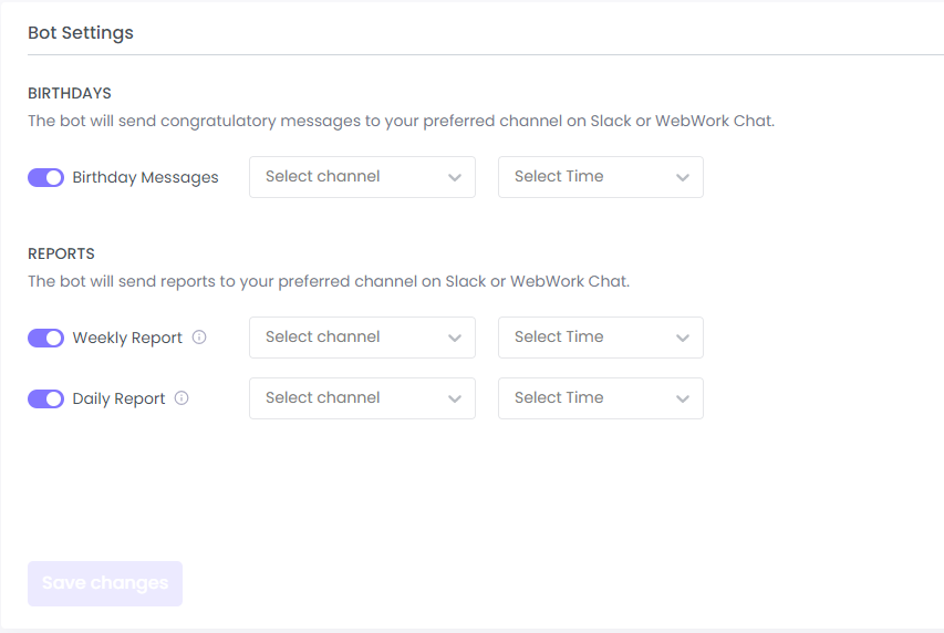 - The WebWork Slack app settings are seen by the Owner/Executive Managers. They can choose channels and times for sending messages. (Also, they can turn off the settings for not sending any messages) → https://www.webwork-tracker.com/app/settings/webwork-ai/chat-automations
