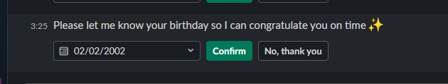 - If the user doesn't exist in the workspace or doesn't have personal information → there is shown the message "Please write the full name so that I can tell you their birthday 🤓 For example: when is Name Surname's birthday?”
