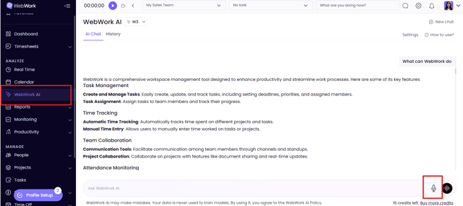 You can use WebWork AI as a chat by opening it from the sidebar. Ask it any questions you want about your workspace members, performance, projects, and anything else you want a quick answer about.