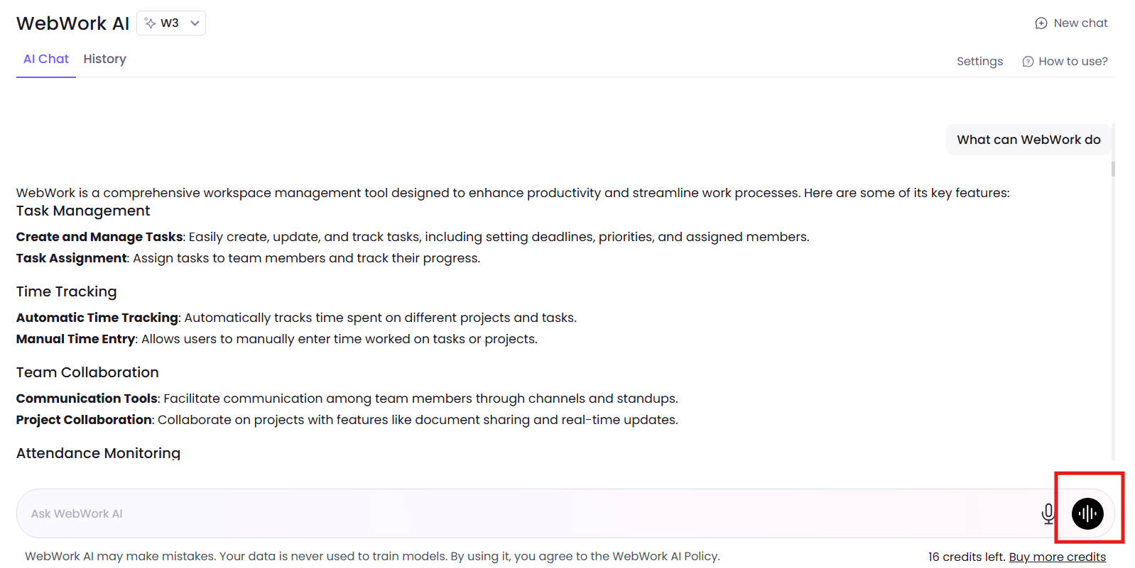 You can also chat with WebWork AI using your voice input. Simply tap the microphone to speak instead of typing. Your voice is instantly converted into text for faster, hands-free interaction.