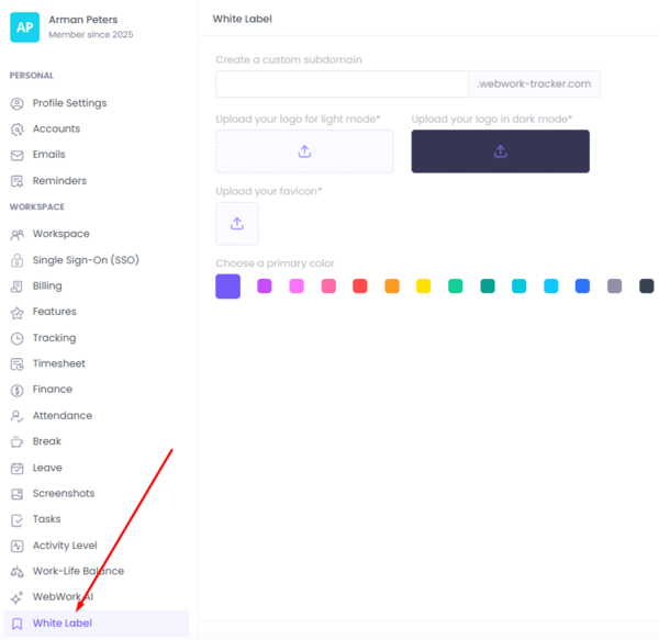 The White Label feature allows you to fully customize your WebWork workspace to reflect your brand. You can change the colors, upload your logo, and even create a personalized URL.